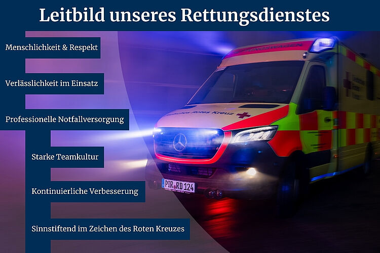 Selbstverständnis Unser Rettungsdienst ist ein kompetenter und innovativer Partner, der kontinuierlich die Qualität der präklinischen Patientenversorgung verbessert. Wir tragen zur Daseinsvorsorge der Bevölkerung bei und streben gemeinsam mit unseren Partnern den idealen Rettungsdienst an. Unsere Arbeit soll dem Menschen nützen.
